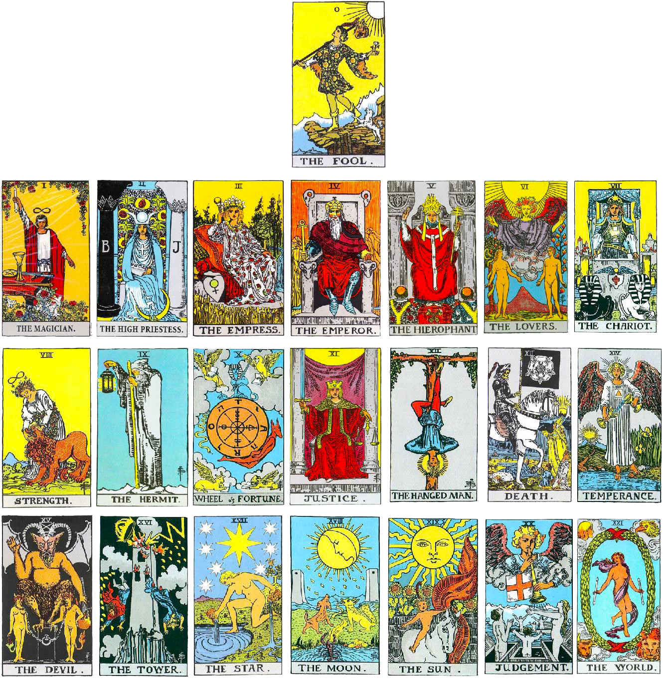 As principais 22 cartas do tarô e as mais importantes, descrevem uma história, retratam a viagem das almas e a sua evolução, desde a Carta do Louco (0), a representação da vinda a existência, o inicio da jornada, até a Carta do Mundo (XXI), que representa a finalização de um ciclo, o fim da jornada e a colheita dos frutos de seus esforços.